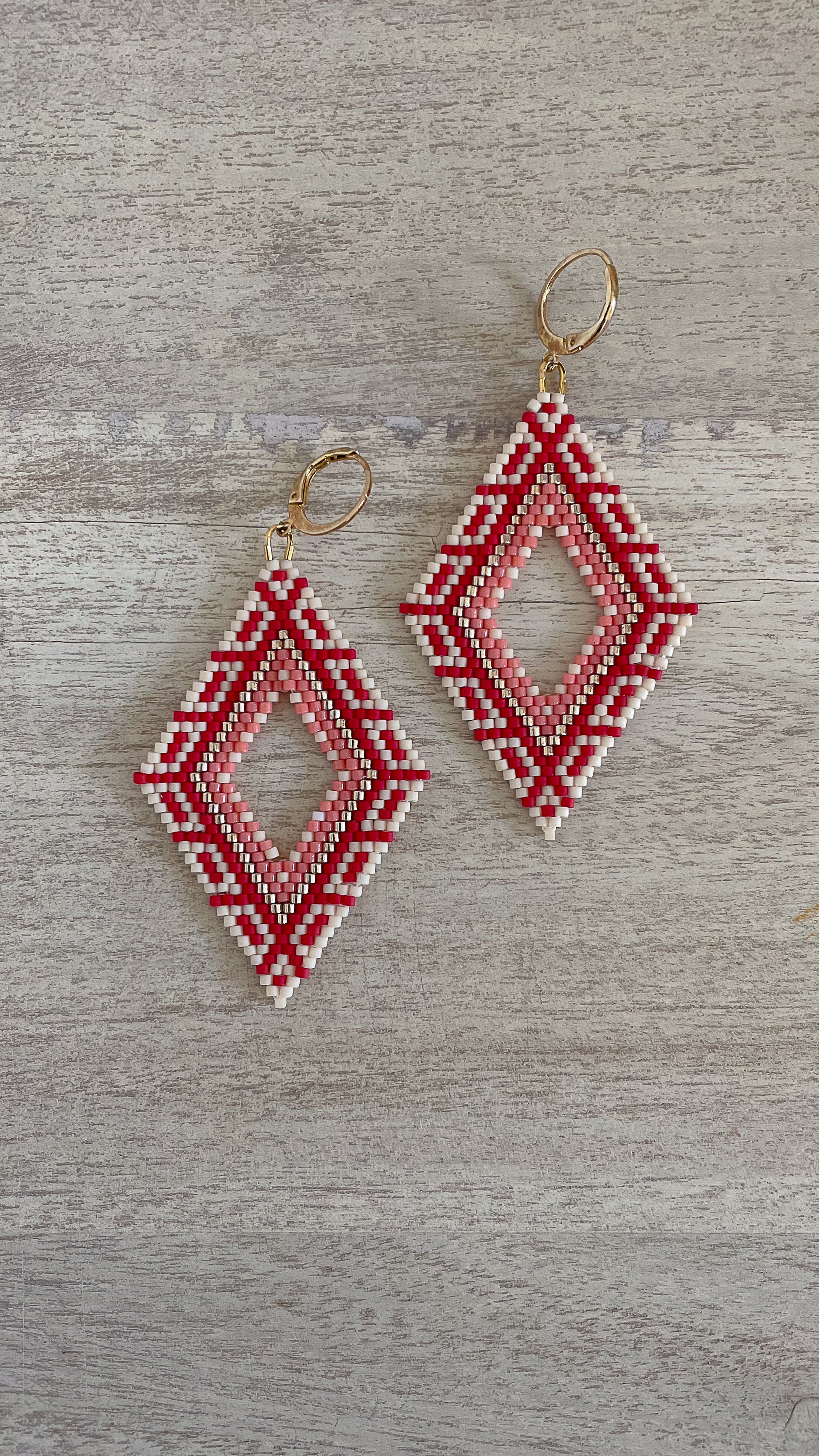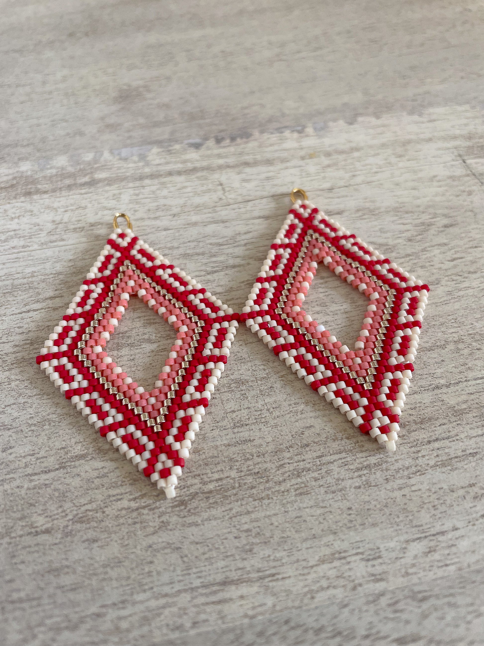 The finished size of one earring is 2.25 x 1.5 inches, and this pattern was designed for size 11 Miyuki Delica seed beads, which is what I recommend for best results. However, if you use different beads, please note that the sizing will vary.