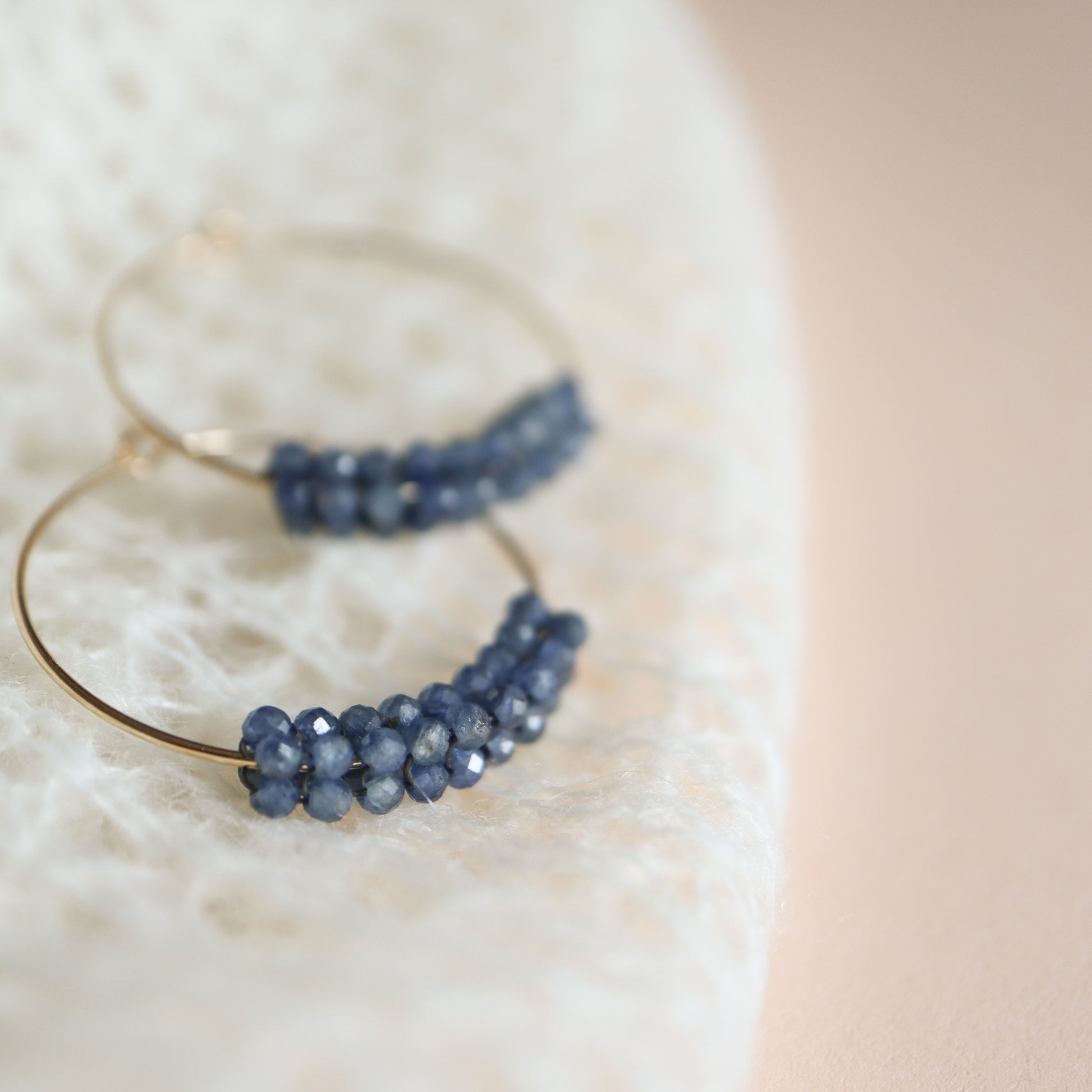 Blue Sapphire beads are woven together one at a time to create the centrepiece of these hoop earrings.