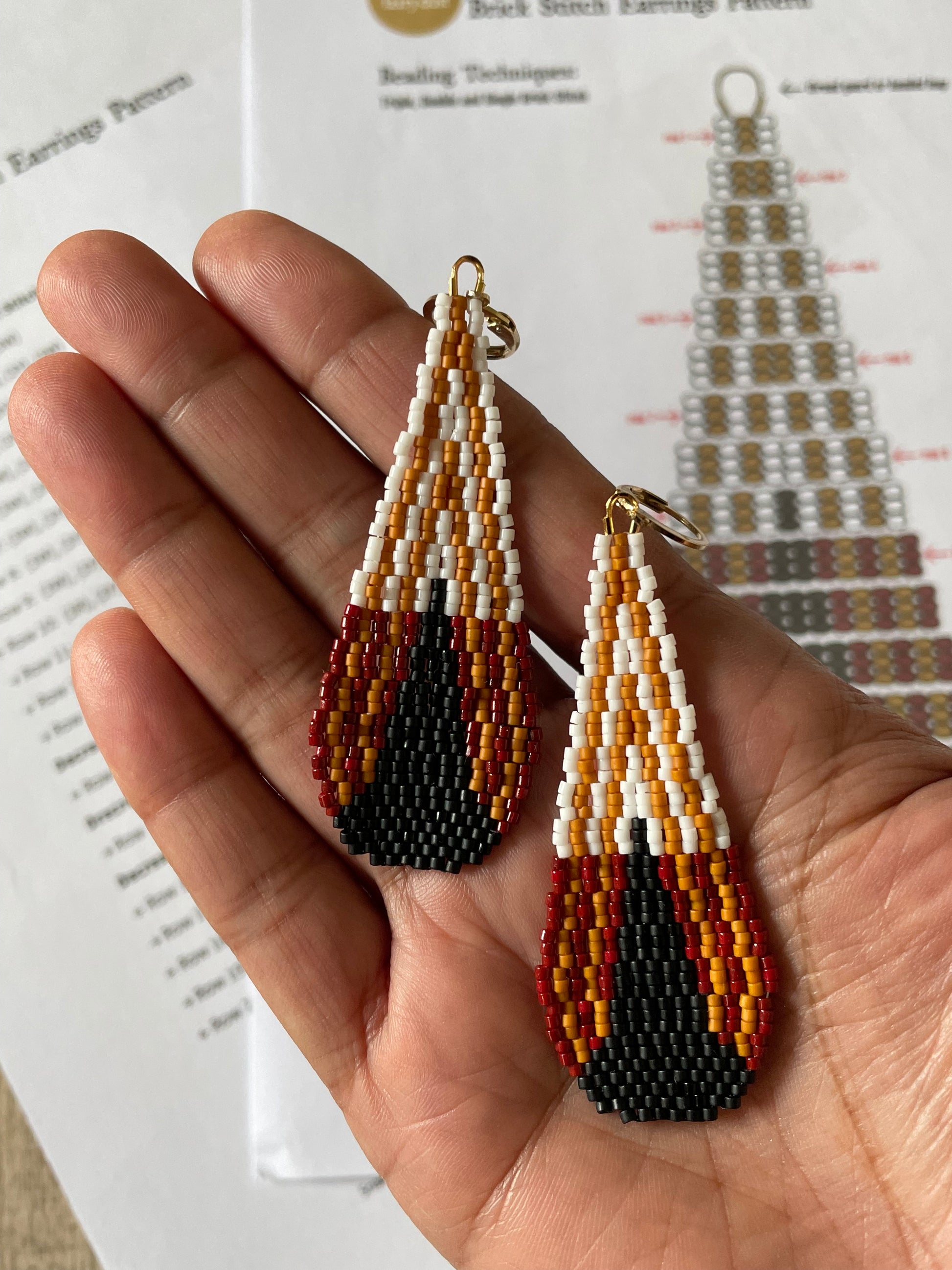 The finished size of one earring is 2.5 x 1 inches, and this pattern was designed for size 11 Miyuki Delica seed beads, which is what I recommend for best results. However, if you use different beads, please note that the sizing will vary.