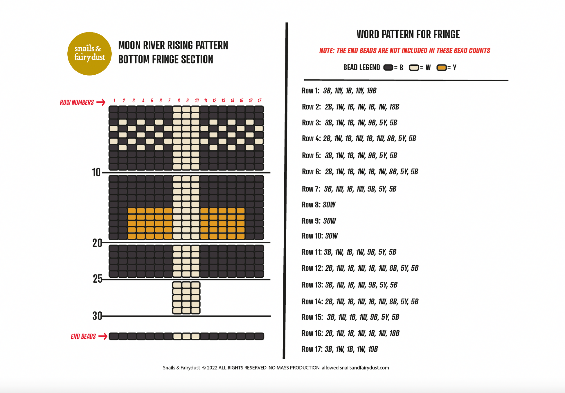 The fringe bead chart is broken up into groups of 10 to help you follow along with the design. The fringe pattern includes a word pattern with the number of beads counts.