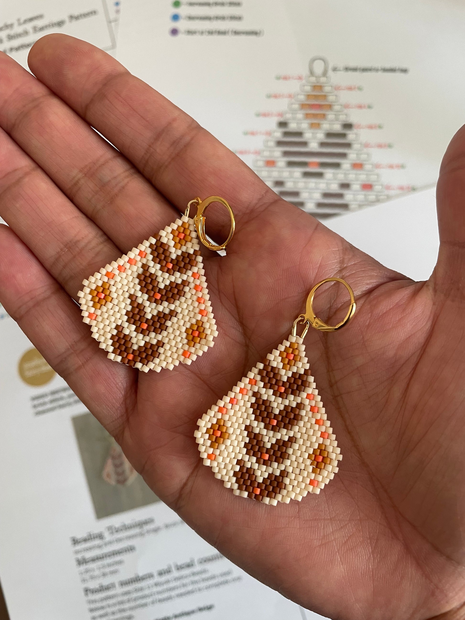 The finished size of one earring is 1.25 x 1.5 inches, and this pattern was designed for size 11 Miyuki Delica seed beads, which is what I recommend for best results. However, if you use different beads, please note that the sizing will vary.
