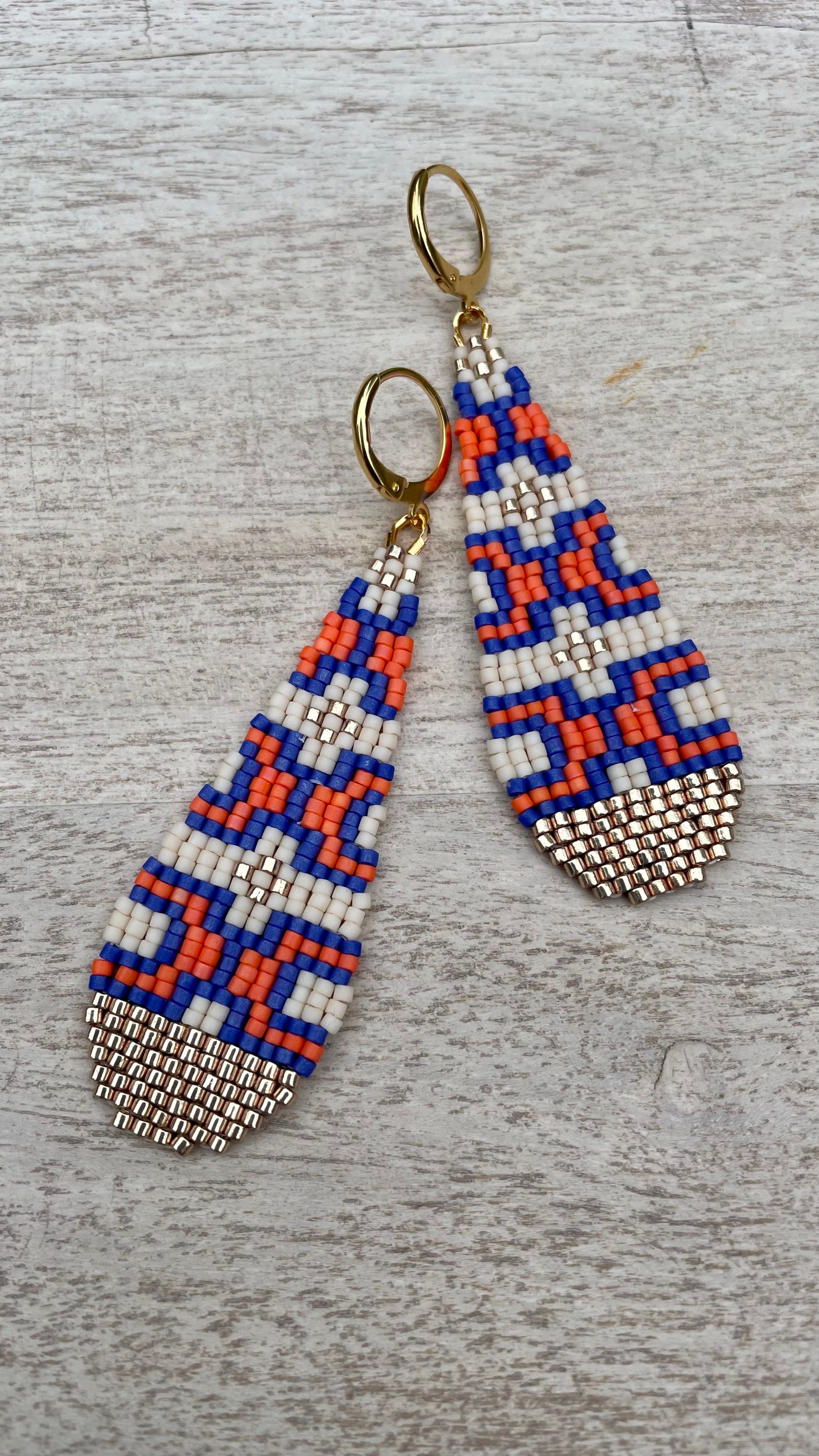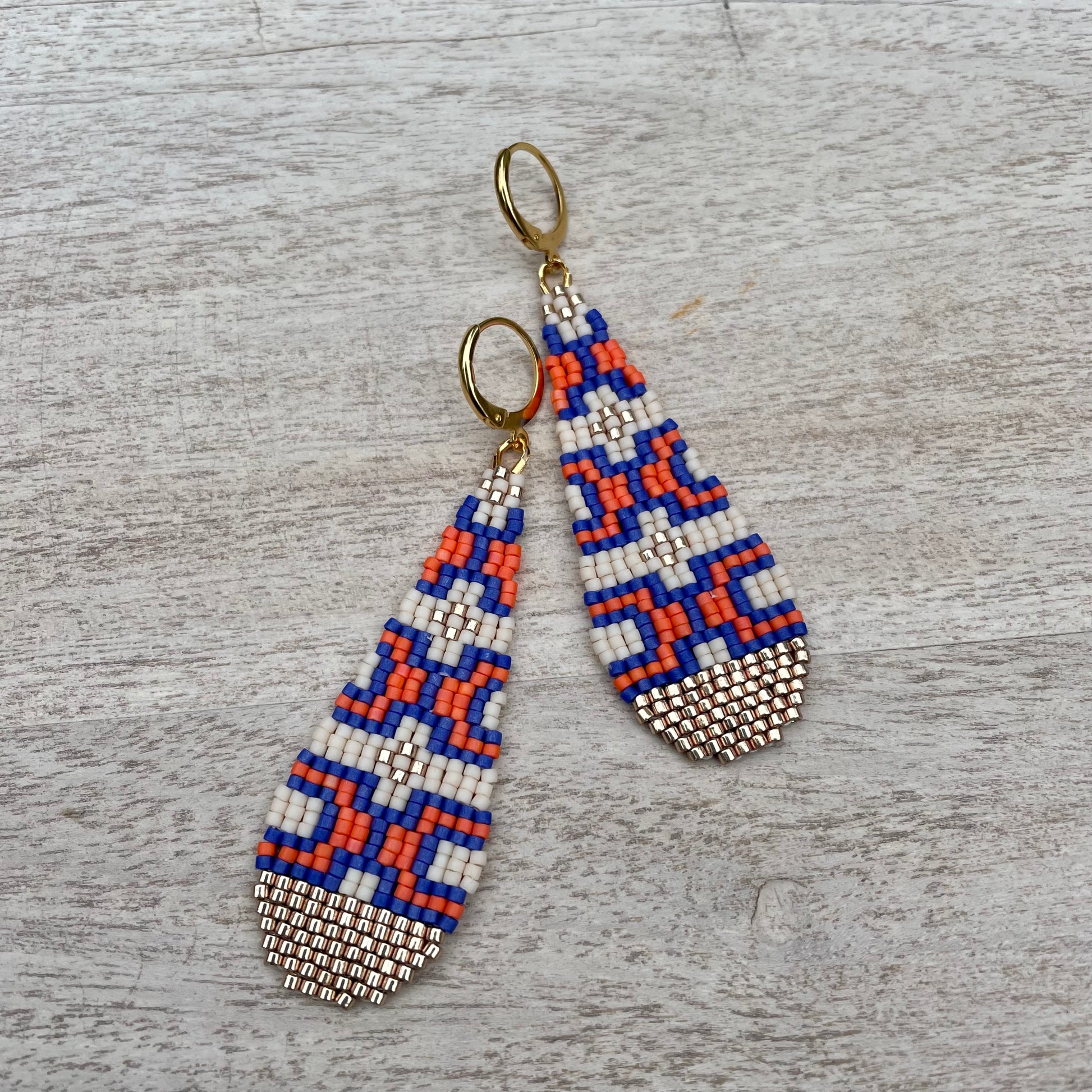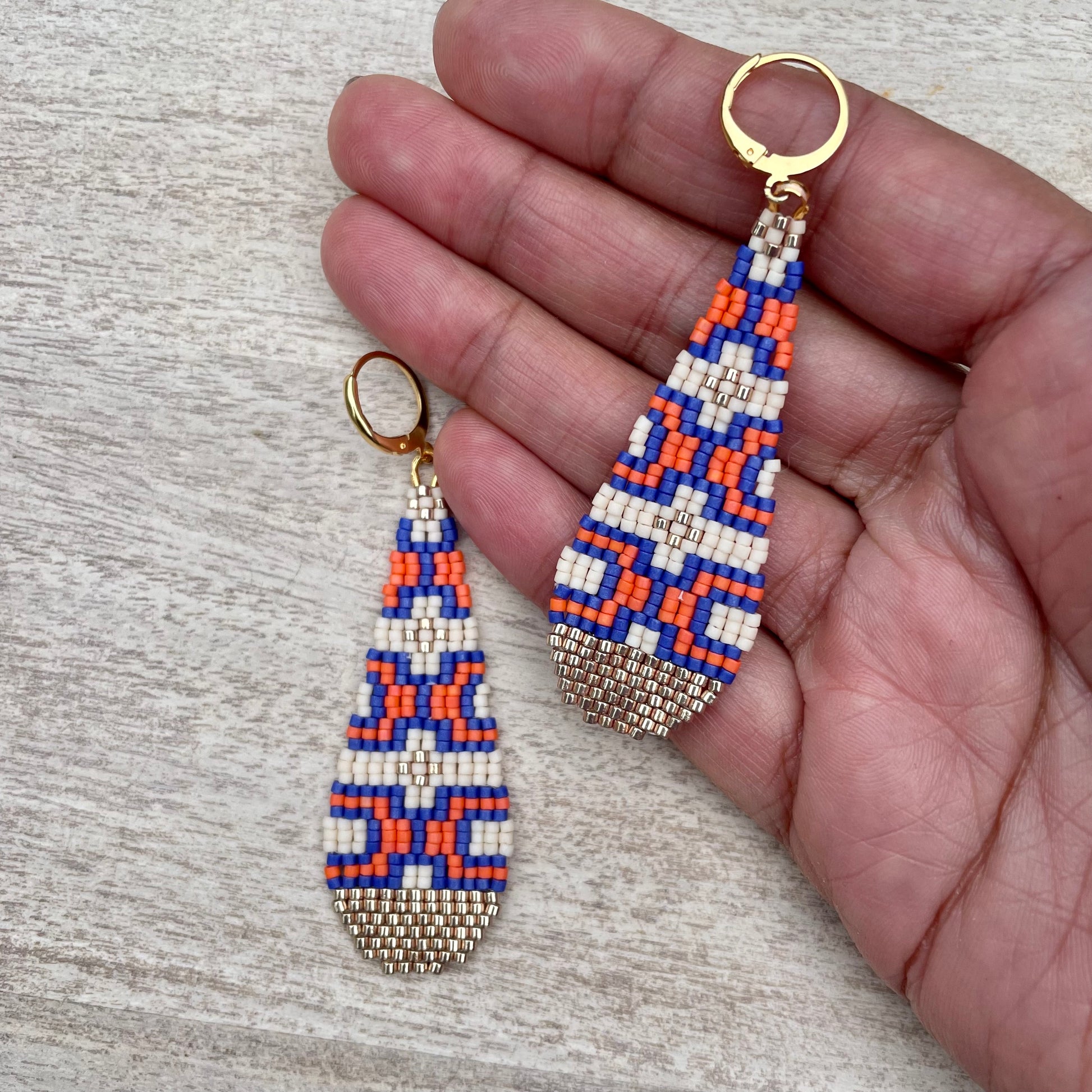The finished size of one earring is 2.125 x 1.5 inches, and this pattern was designed for size 11 Miyuki Delica seed beads, which is what I recommend for best results. However, if you use different beads, please note that the sizing will vary.